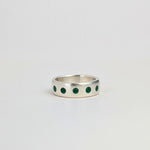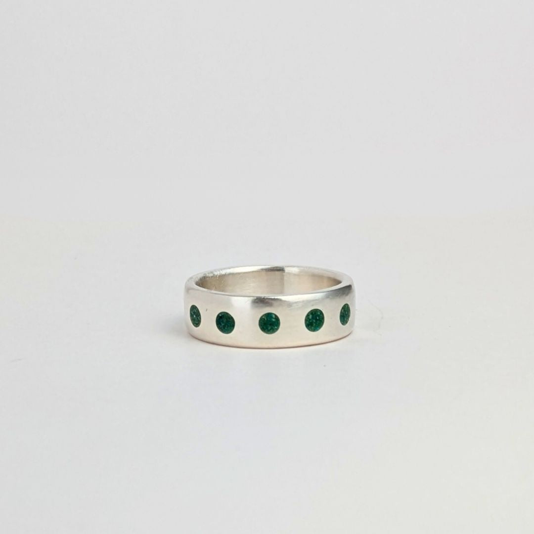 This ring features a full eternity of large dotted chrysocolla inlay on a brushed sterling silver band.