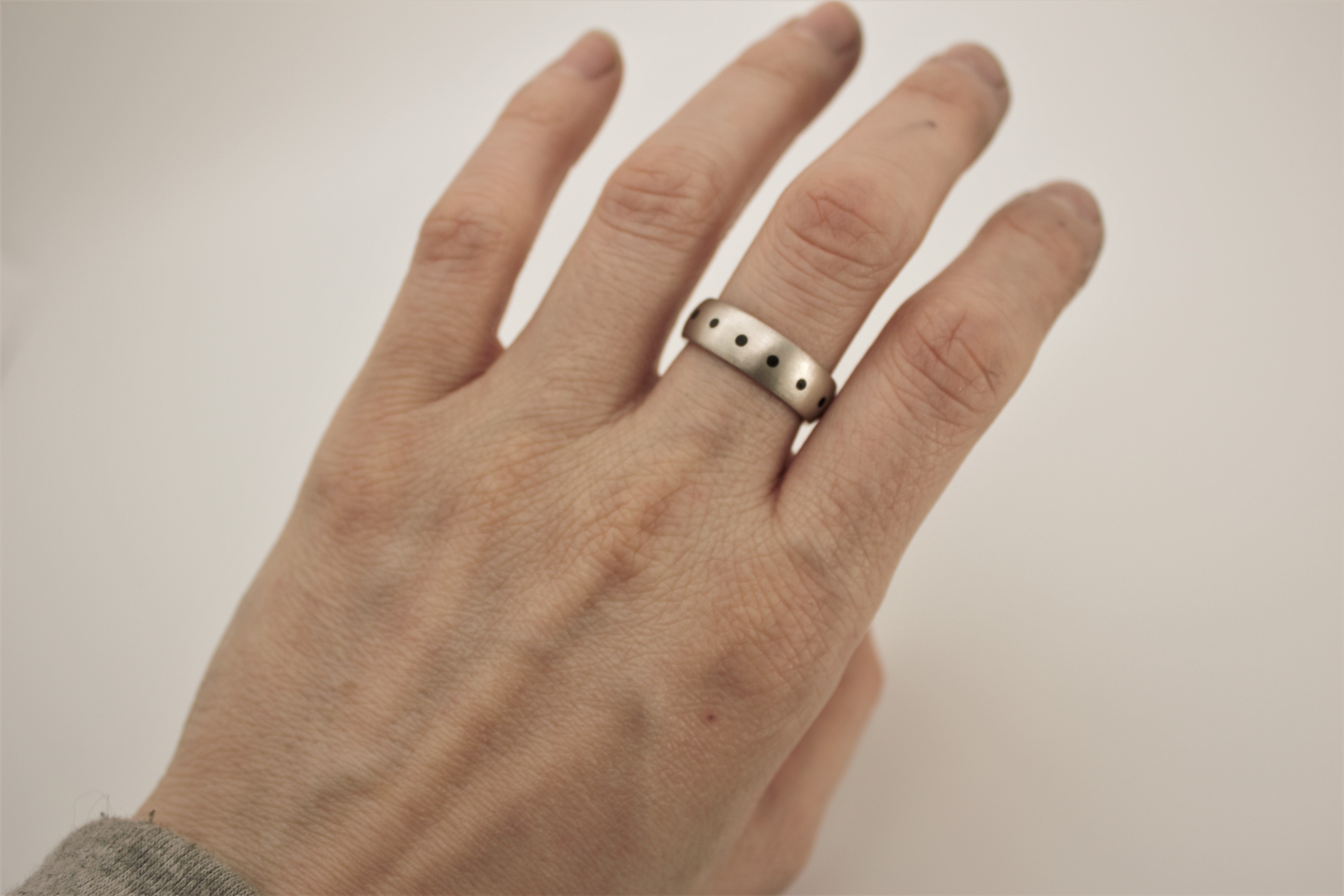 Pictured: Full eternity of dotted Black Jet stone inlay in a brushed sterling silver band.