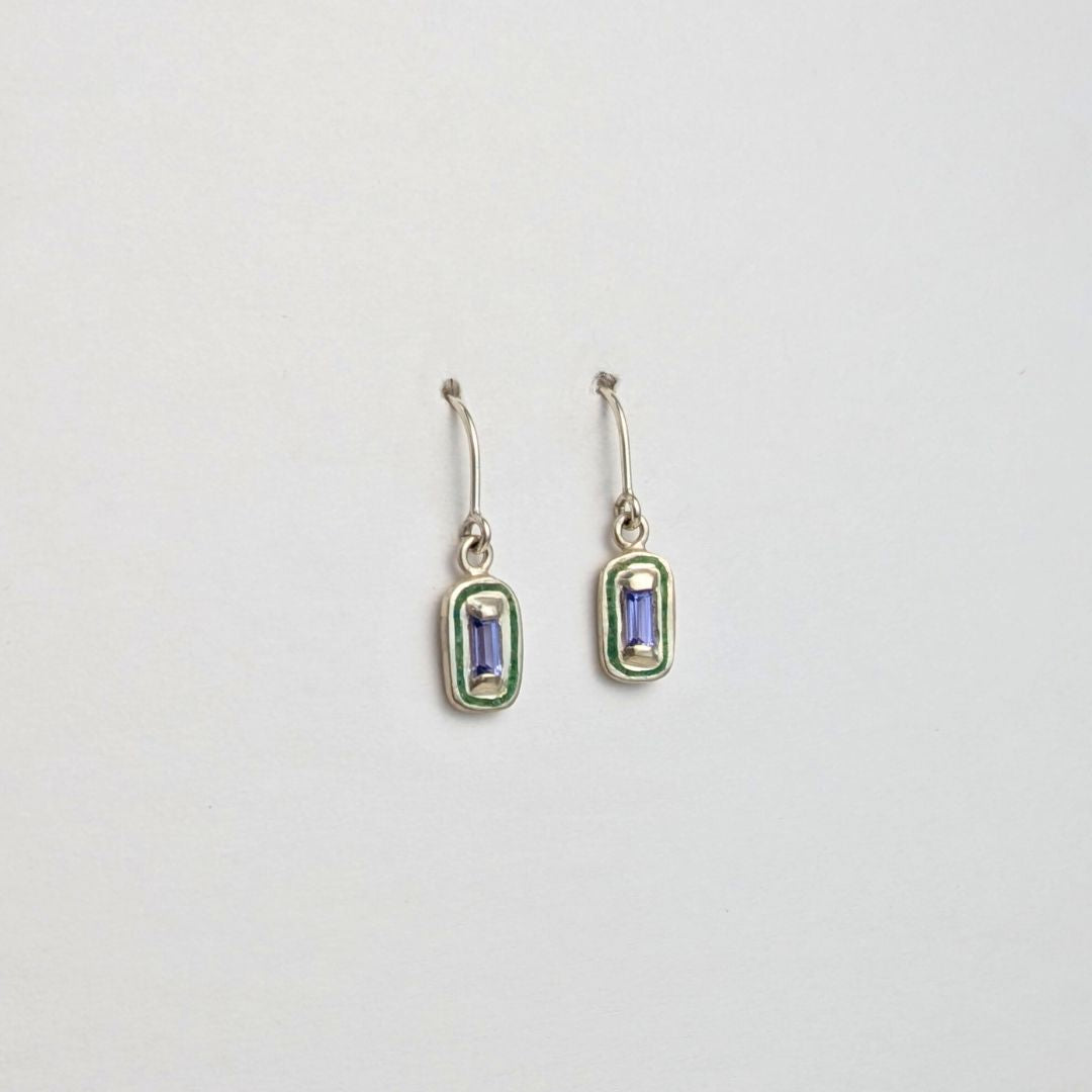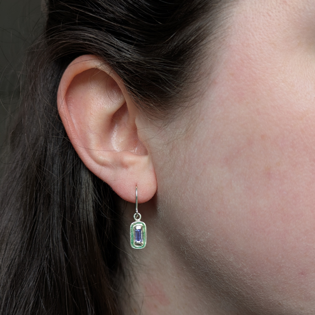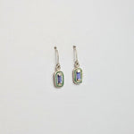 These sterling silver hook earrings feature faceted baguette shaped tanzanite that are bar set into a hand carved mounting surrounded by a line of green chrysocolla for an added hint of color.