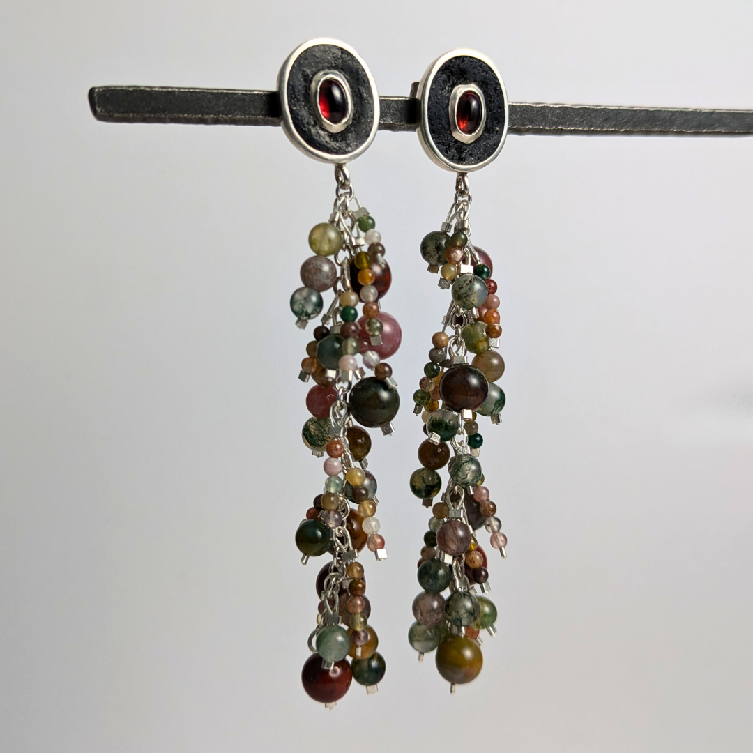 These eye-catching earrings showcase a lengthy tassel of Indian agate beads strung on durable beading wire and anchored with sturdy stud tops. The sizable tops boast vibrant garnet cabochons encircled by black jet stone inlay. Perfectly balanced with large ear nuts, these statement earrings are a must-have for any jewelry collection.