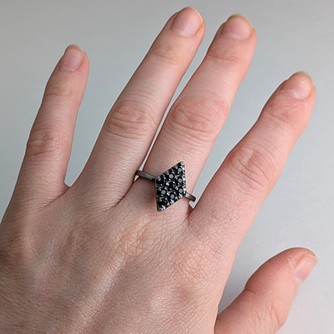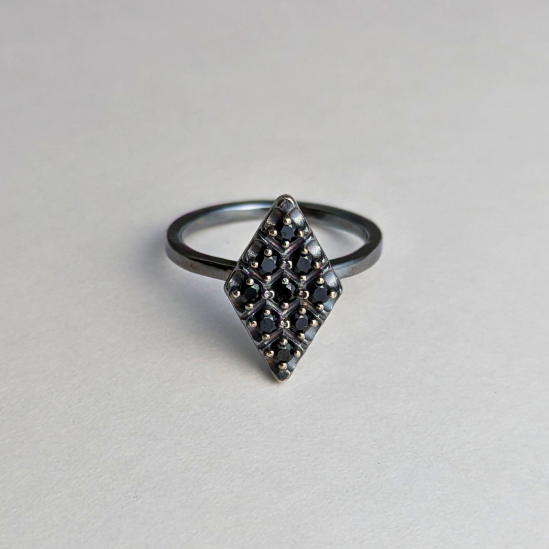 This ring features nine 2mm black spinel gemstones in an elevated diamond shaped cluster setting in oxidized sterling silver.