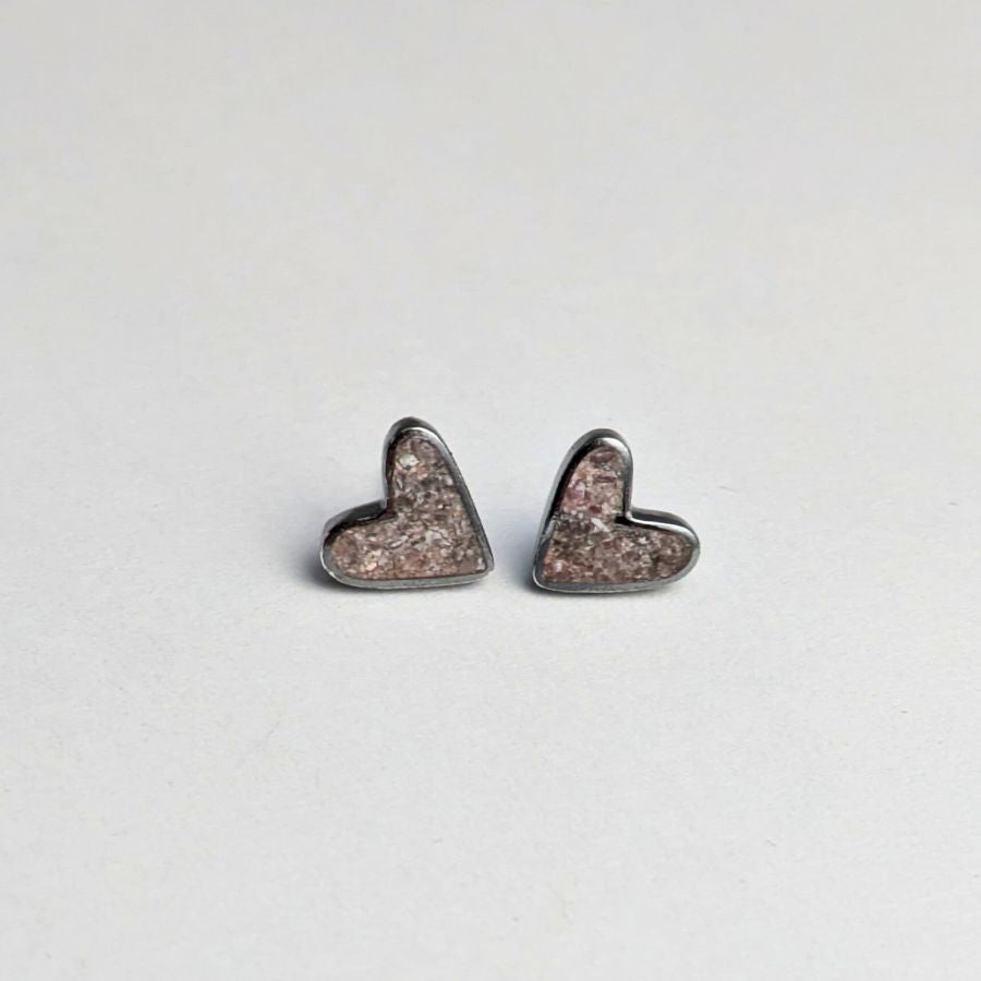 These elegant heart-shaped studs are inlaid with lepidolite and oxidized sterling silver settings. Comfortable and stylish, these studs are the perfect addition to any outfit.
