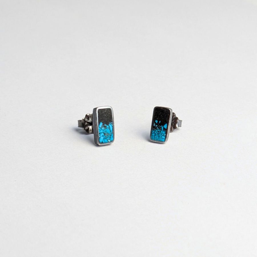 These mini rectangle studs are inlaid with a mixture of crushed turquoise at the base and gradates into crushed black jet stone, making them perfect for everyday wear with a touch of natural beauty.