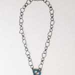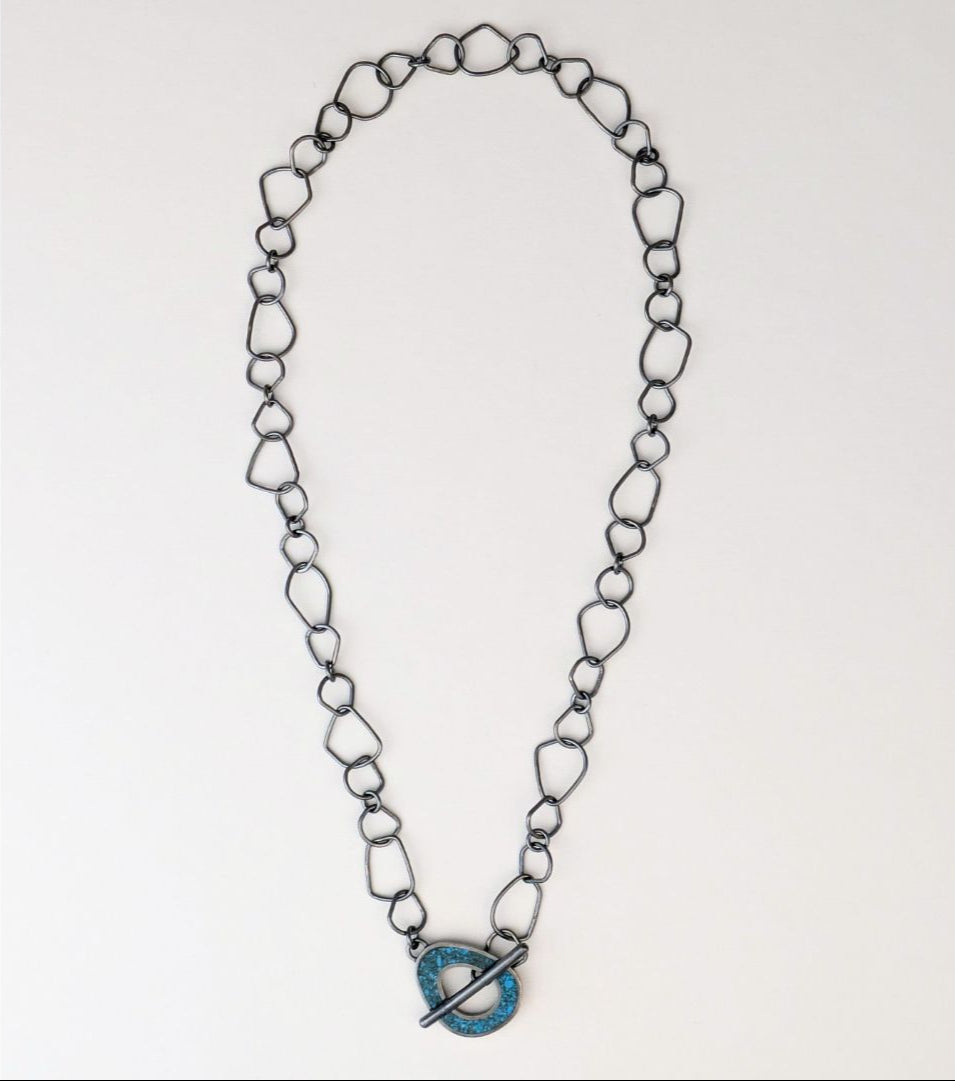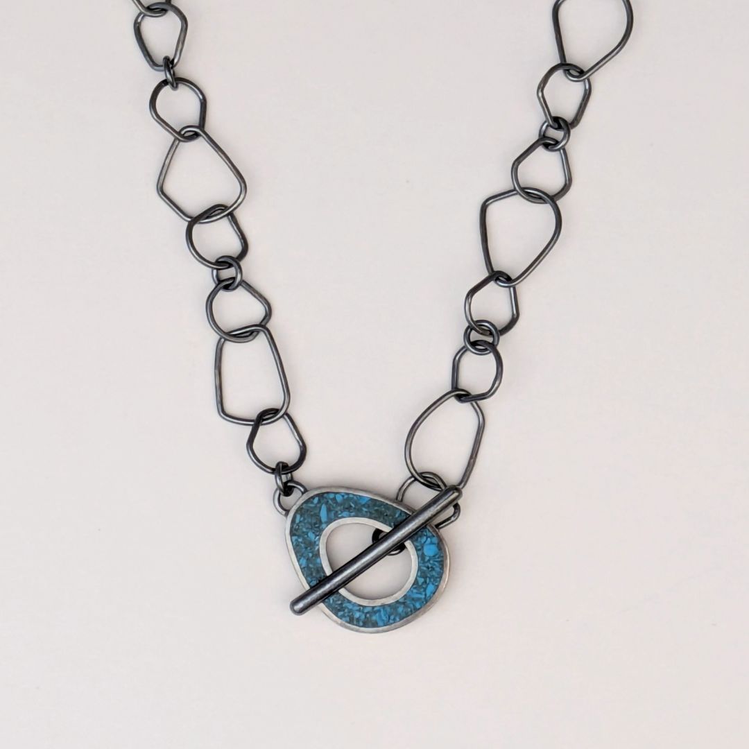 Introducing the Irregular Chain to my handmade chain collection. I made new style of chain inspired by the unique shape of this toggle clasp. This necklace has been oxidized and features crushed turquoise inlaid into a handmade toggle clasp.