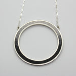 Circle pendant featuring mother of pearl fading into jet black stone on a sterling silver chain with a lobster clasp.